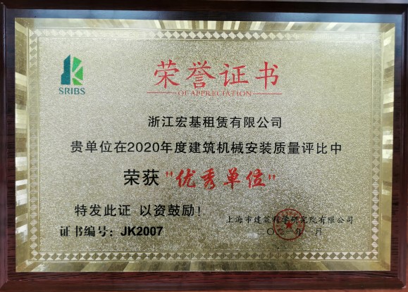 2020年度建筑機械安裝質量評比中榮獲“優秀單位”