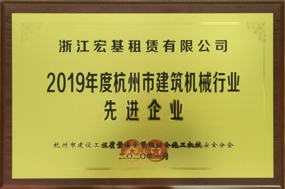 2019年度杭州市建筑機械行業先進企業頒發單位:杭州市建設工程質量安全管理協會施工機械安全分會