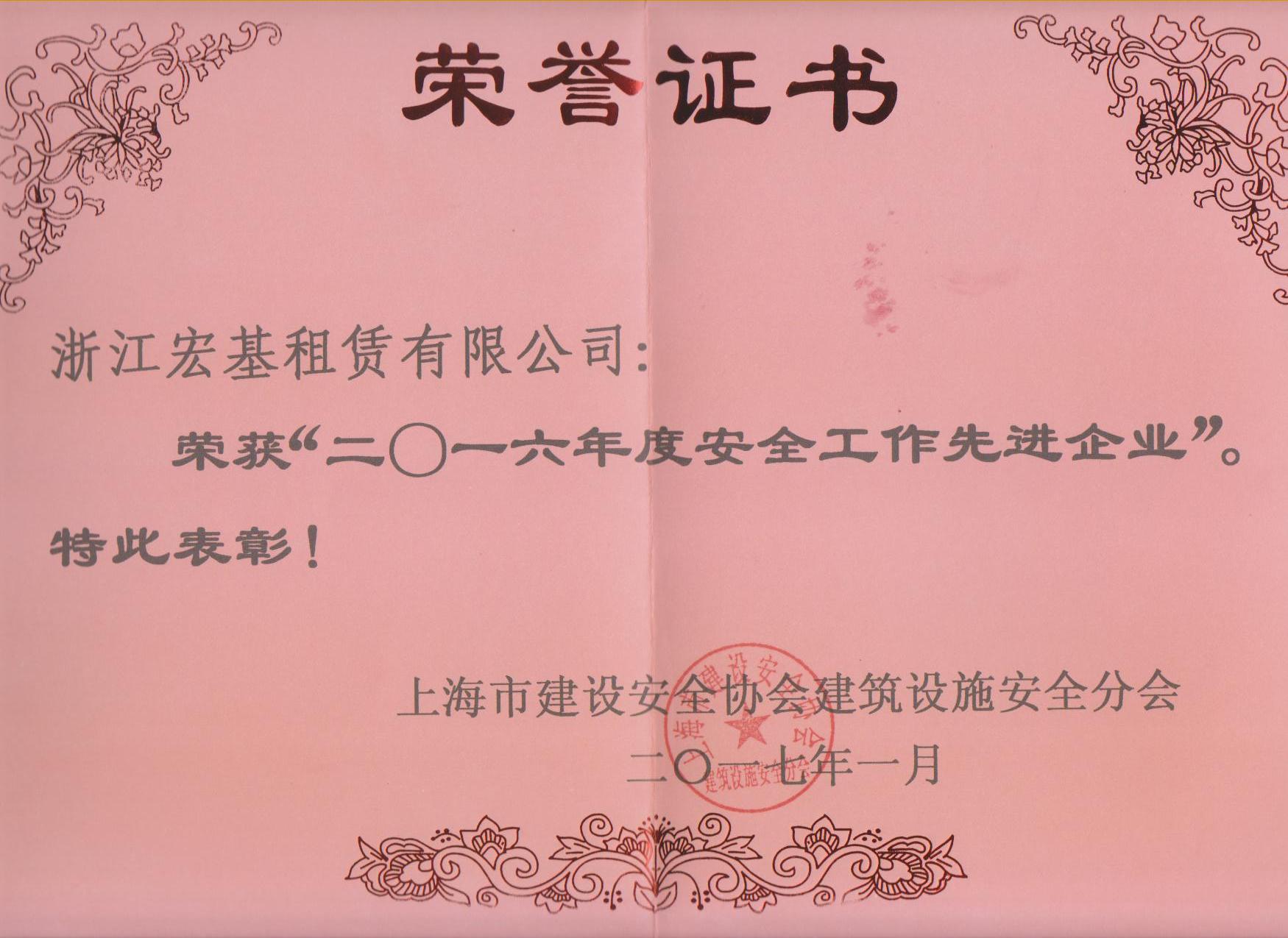 2016年度安全工作先進企業(yè)頒發(fā)機關(guān):上海市建設(shè)安全協(xié)會建筑設(shè)施安全分會