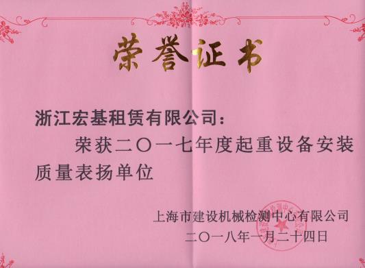 2017年度起重設(shè)備安裝質(zhì)量表揚單位頒發(fā)機關(guān):上海市建設(shè)機械檢測中心有限公司