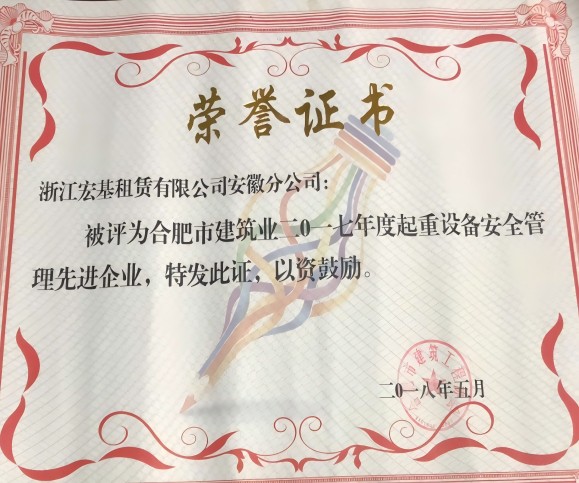 合肥市建筑業(yè)2017年度起重設(shè)備安全管理先進企業(yè)頒發(fā)機關(guān):合肥市建筑工程協(xié)會