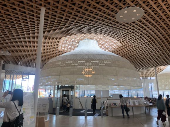四、在岐阜市政府建筑課工作人員的講解下,參觀新落成且已使用的岐阜市立中央圖書館工程,此圖書館由著名設計師伊東豐雄設計,獨特的木制格子屋頂吸引了大家的眼球,場內設施圍繞“匯集市民的知識與文化的創造森林”的理念。